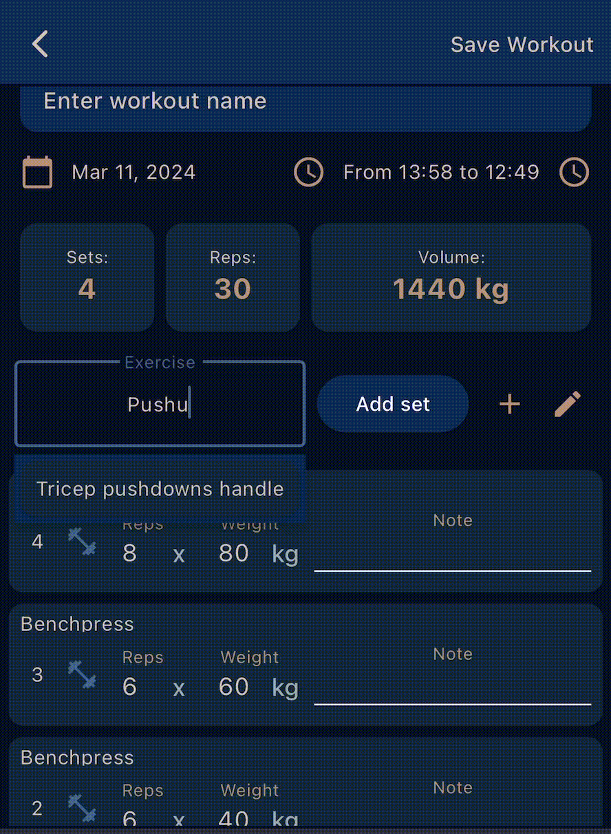 Don’t let the app distract you from your workout. Simple logging, where you can add whatever exercise you want by simply using text. No more digging through enormous dropdown menus with exercises you don’t care about.